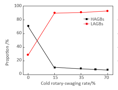 Proportion of HAGBs and LAGBs of the TB9 titanium alloy before and after cold rotary-swaging deformation