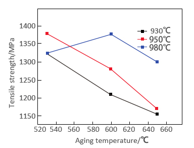 Tensile strength curves of TC11 Titanium alloy at different solution temperatures and aging temperatures