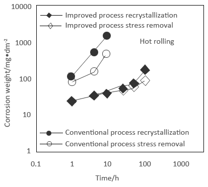 The relationship between corrosion weight gain and time of Zr-4 alloys coated tube samples processed by different processes
